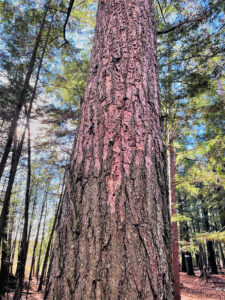 Woodpeckers have flaked off outer layers of bark on this hemlock main stem, leaving the tree with a reddish cast. / Photo Credit: Wisconsin DNR