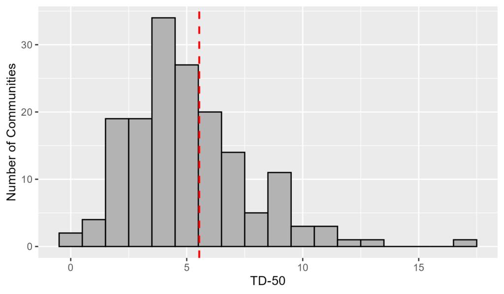 TD-50 on the x axis and number of communities on the y axis. The red dotted line shows the average TD-50 (5.53) across all 164 communities.