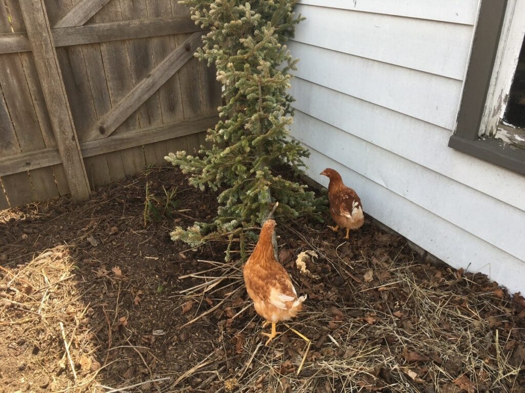 Two young chickens enjoying a mostly delimbed tree that was harvested in late November and is still green on April 28!